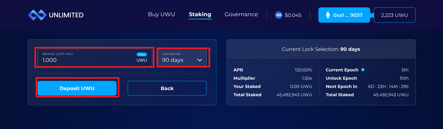 **To stake** your $UWU, simply choose your desired <mark style="color:blue;">**lock-up**</mark> period and the amount of <mark style="color:blue;">**tokens**</mark> you wish to stake, then click "Deposit UWU" and <mark style="color:blue;">**confirm**</mark> the transaction in your wallet. If you change your mind, click "Back" to cancel the <mark style="color:blue;">**staking process**</mark>.